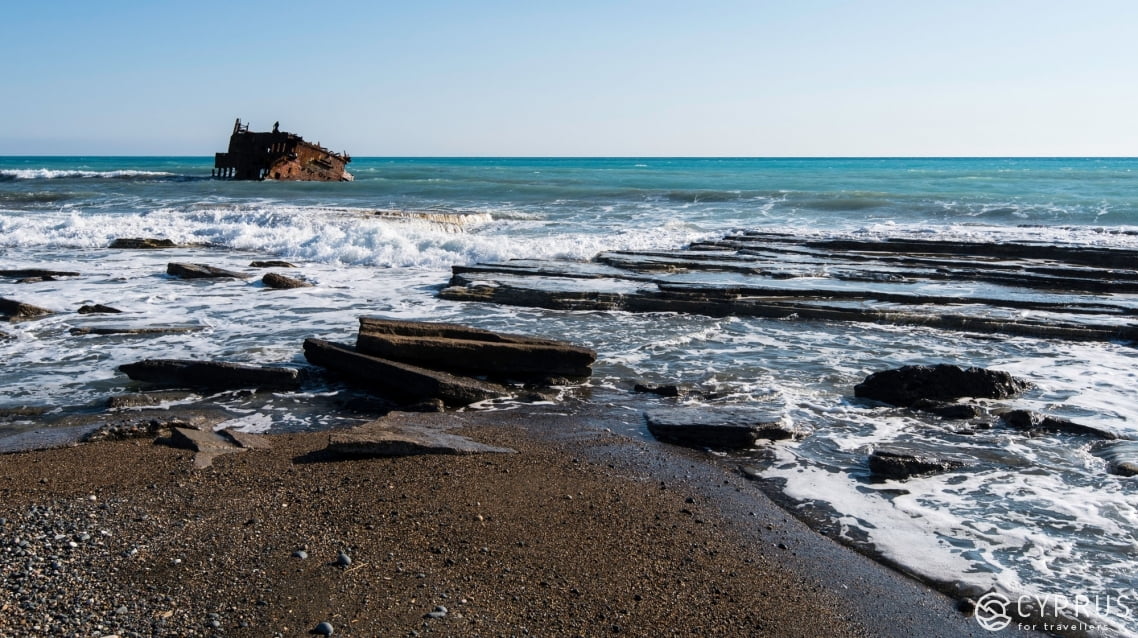 Pebble beaches are situated to the right from there. And they are abandoned as well, with stones and small rocks growing outside the sea here and there. You might see Episkopi village in the distance. There’s also a small island close to the seashore with the remains of the wrecked ship. The view is captivating.
